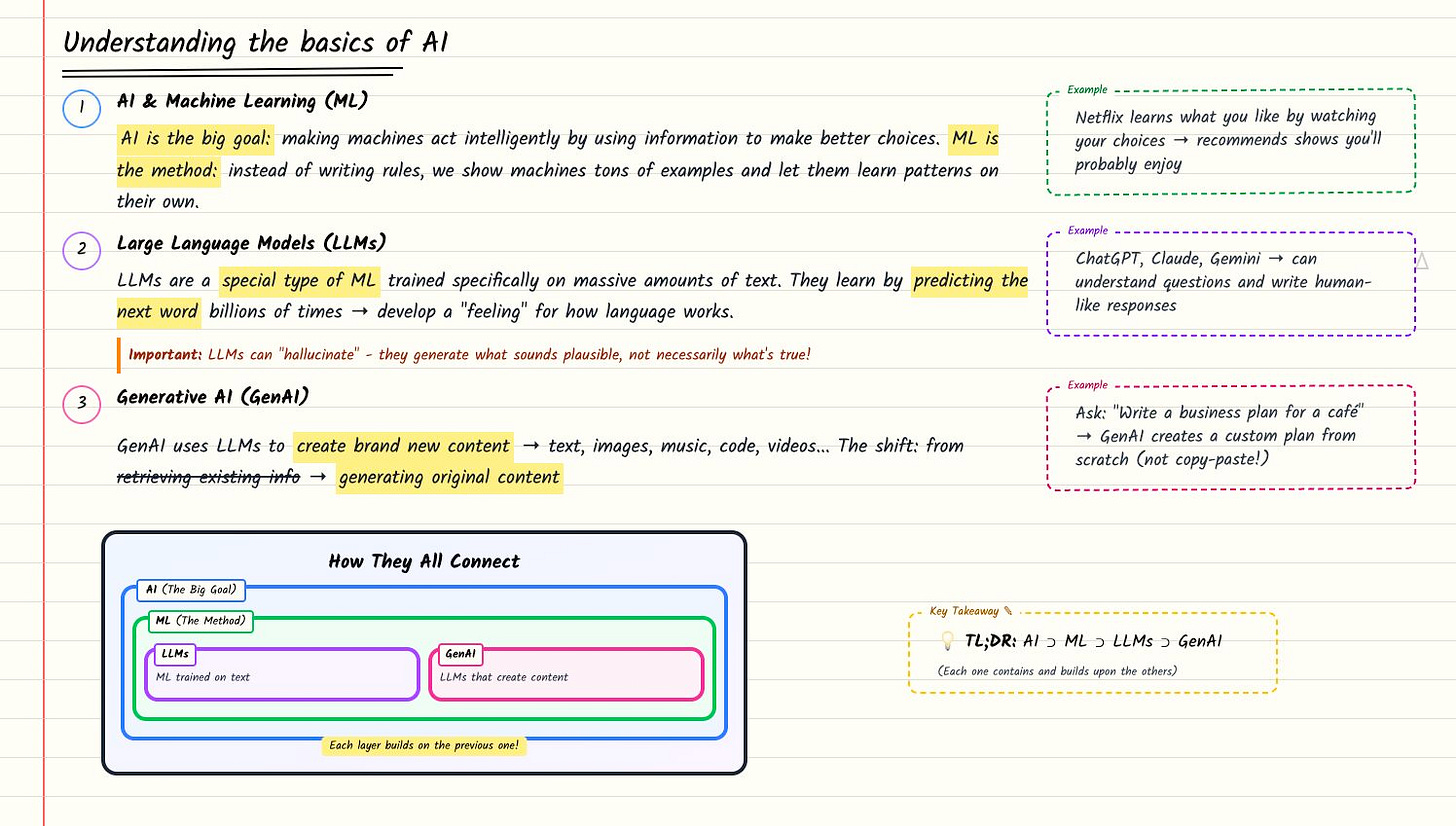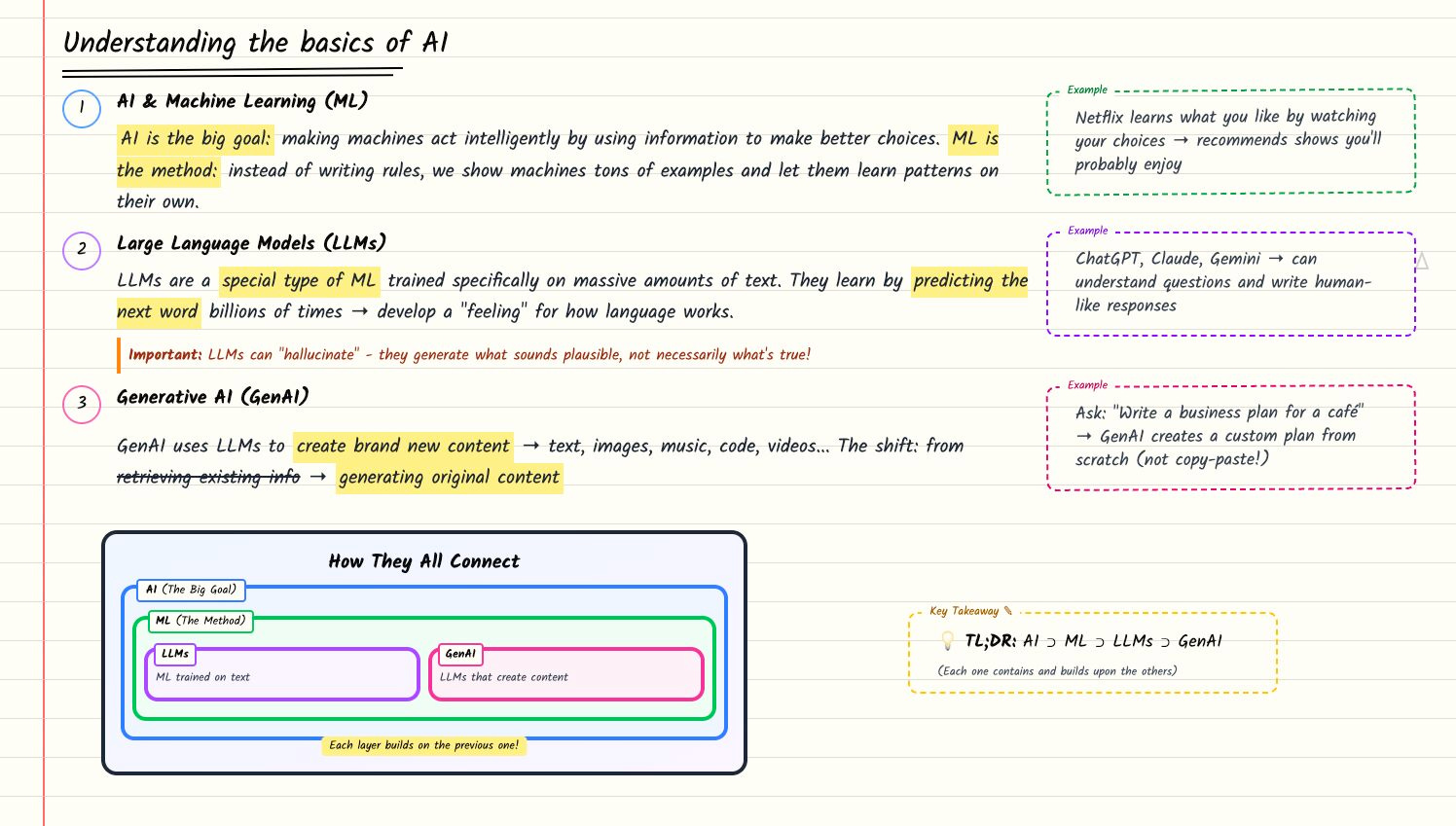 AI is the dream, ML is the approach, DL is the technology, LLMs are one application, and GenAI is the outcome that feels the most human.